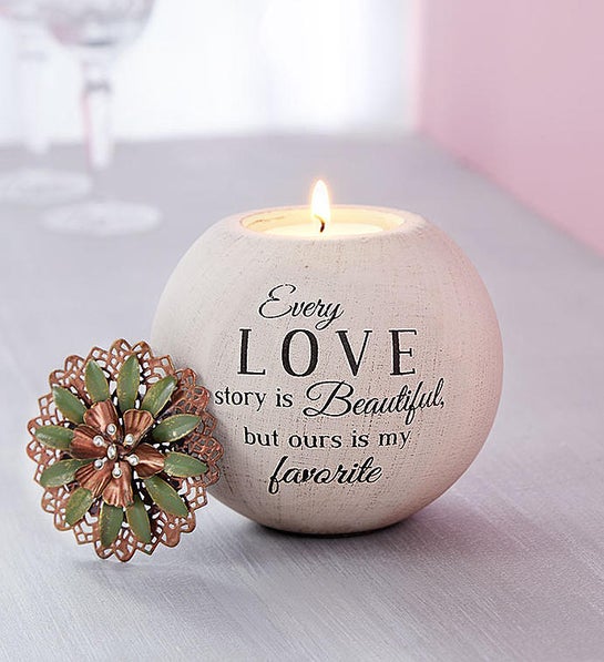 Spark romance with our tealight candleholder. Featuring a vintage-inspired floral lid, the terra cotta keepsake comes with a sweet message: “Every love story is beautiful, but ours is my favorite.” It’s the perfect Valentine’s gift for the one who lights up your life, especially when you add our rose-scented Yankee Candle tealight gift set.