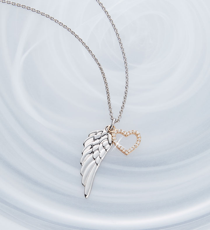 Here’s a beautiful way to keep your guardian angels close to your heart. Our angel wing necklace from CRISLU is crafted from sterling silver and features a wing finished in pure platinum and an18K gold heart pendant, sparkling with flawless cubic zirconia stones. An elegant reminder of the grace, comfort and protection received from the loved ones in our lives.