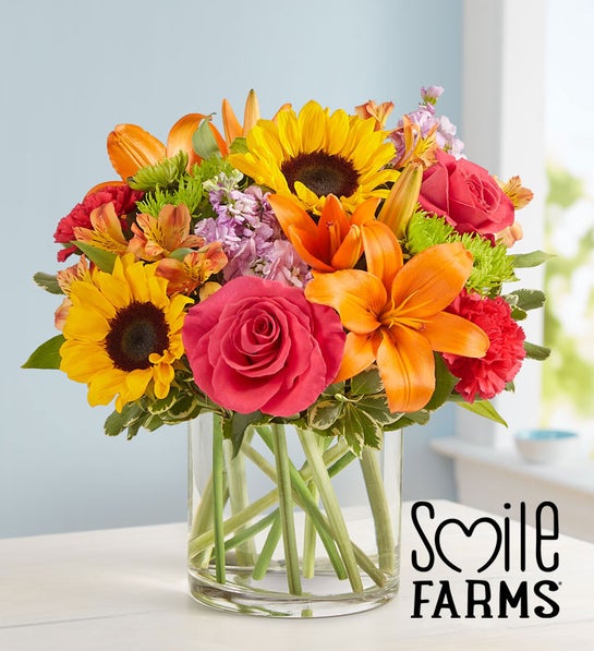 Like a warm embrace, our vibrant bouquet delivers your sentiments to someone special. A rich gathering of yellow and orange blooms, with pops of bright pink and purple, it's more than a gift - it's a way to express how you feel inside.