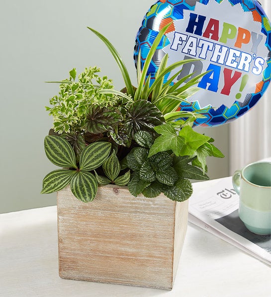EXCLUSIVE Here’s a gift Dad can enjoy long after Father’s Day. Our classic dish garden is gathered with a selection of lush green plants to celebrate the man of the day. Complementing the arrangement is our grey-washed wooden cube, featuring natural tones and textures sure to spruce up his office space or man cave. Add to the festivities with a colorful balloon.