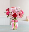 Inspired by the rich beauty of the European countryside, our romantic bouquet reveals all the feelings you have in your heart. Fresh-picked pink & red blooms are on display inside a glass vase finished with ribbon, creating a timeless gift for someone you love.