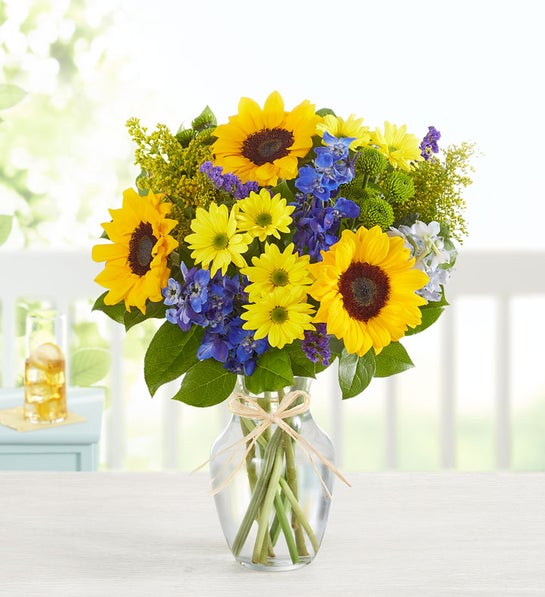 Inspired by the colorful charm of the European countryside, our best-selling summer bouquet is gathered with fresh-picked blooms, revealing the rustic beauty of nature. Shades of golden yellow and rich blue pop against lush greenery, creating a timeless gift for someone special to enjoy.