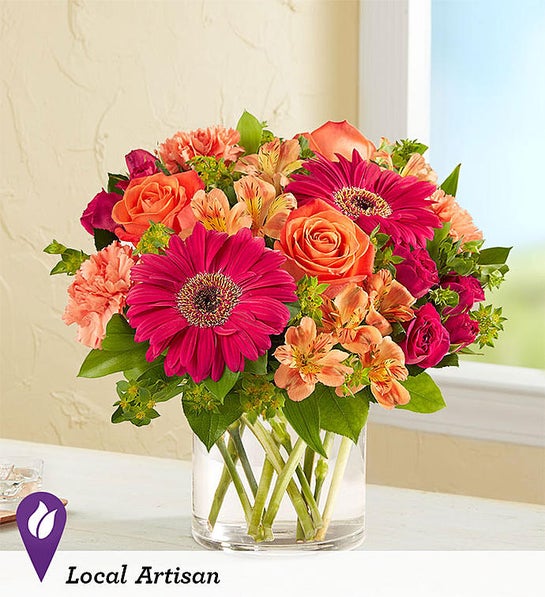 LOCAL ARTISAN Inspired by the warm shades of the setting sun, our radiant bouquet is one you’ll be passionate about sending. A dazzling mix of hot pink and orange blooms pop against lush greenery. Designed by Margaret Fleegal from our shop in Fairfax, Virginia, it’s a gift guaranteed to surprise & delight.