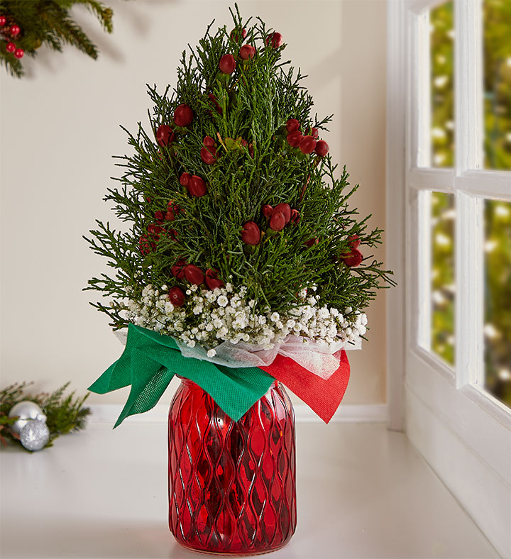 Farmer’s Choice The most charmingly unique holiday décor, straight from our floral farms! Three hand-tied bouquets are filled with fresh greenery, taking the shape of Christmas trees, and paired with our rustic mason jar. For more festive warmth, add a strand of white lights.