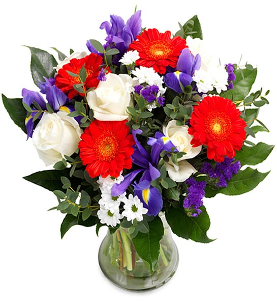 This stand-out grouping of bright red Gerberas, deep blue irises and white roses partnered with aromatic eucalyptus!