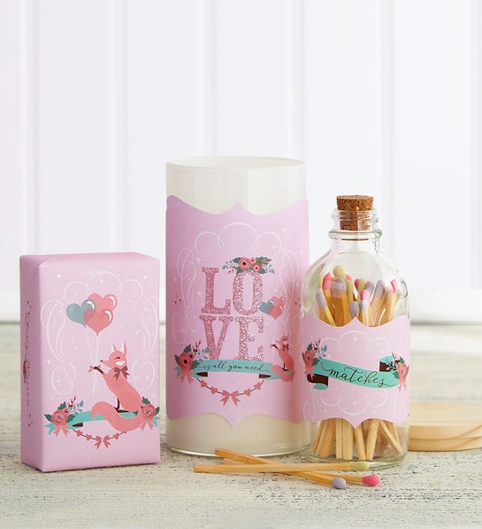 EXCLUSIVE Spark the love with our Valentine’s gift set. Features a cherry blossom-scented candle and soap (along with matches), all designed with charming pink woodland artwork and a “Love Is All You Need” sentiment. Designed in a decorative, coordinating gift box, this special collection is the perfect surprise for your sweetheart.
