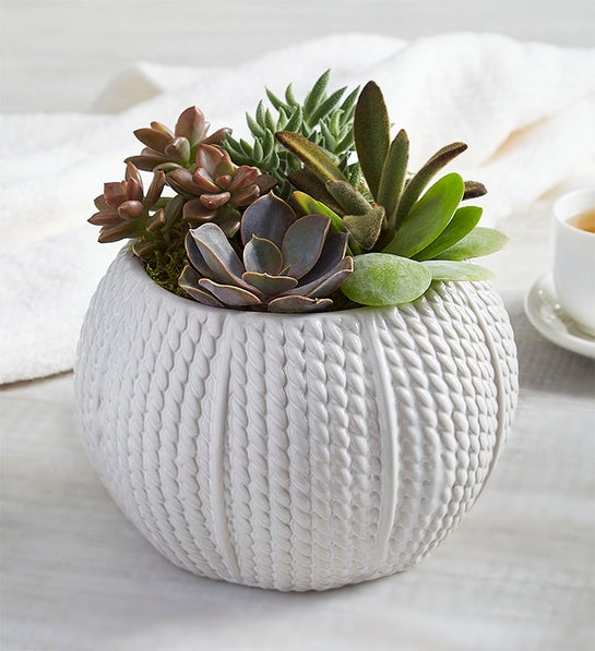 Our garden of green succulents brings lush style to the cozy, pumpkin-inspired planter it’s designed in. The natural beauty of these easy-care plants, paired with our detailed, textured ceramic planter, creates a unique and stylish fall display.