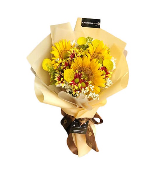3 Sunflowers, Yelow pom-poms, and Yellow and White Daisies in a bouquet