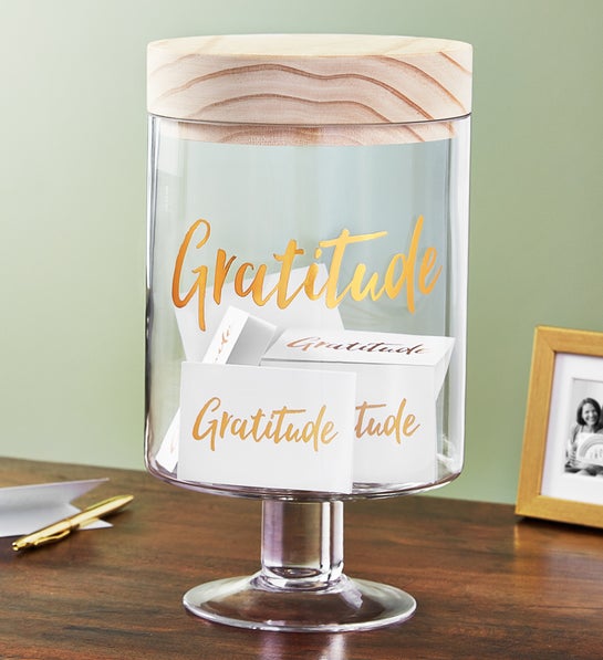 “The more grateful you are, the more present you become, the more joy you bring into your life.” Our Gratitude Jar lets you begin each day with an open heart by recording all that you are thankful for. The glass jar is beautifully hand-crafted with a wooden lid and includes elegant bronze foil gratitude cards to write on. A unique keepsake to lift the spirits of someone special in your life, or to inspire you each day.